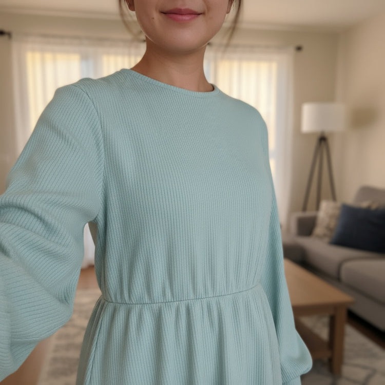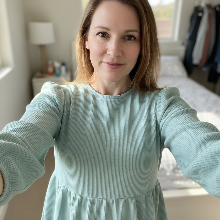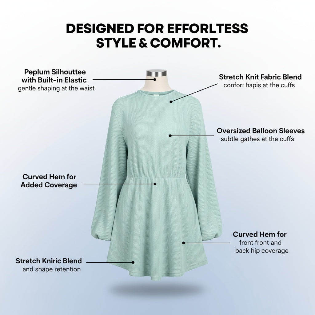 β’ Softly flared peplum waist with built-in elastic β’ Oversized balloon sleeves with gathered cuffs β’ Curved hem for extra coverage and comfort